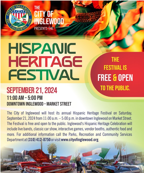 Join the City of Inglewood for its annual Hispanic Heritage Festival. This special event will recognize and celebrate the contributions of the Hispanic and Latino cultures. The festival will feature a classic car show, live bands, vendor booths, activities for children, health screenings, a food court, and more.